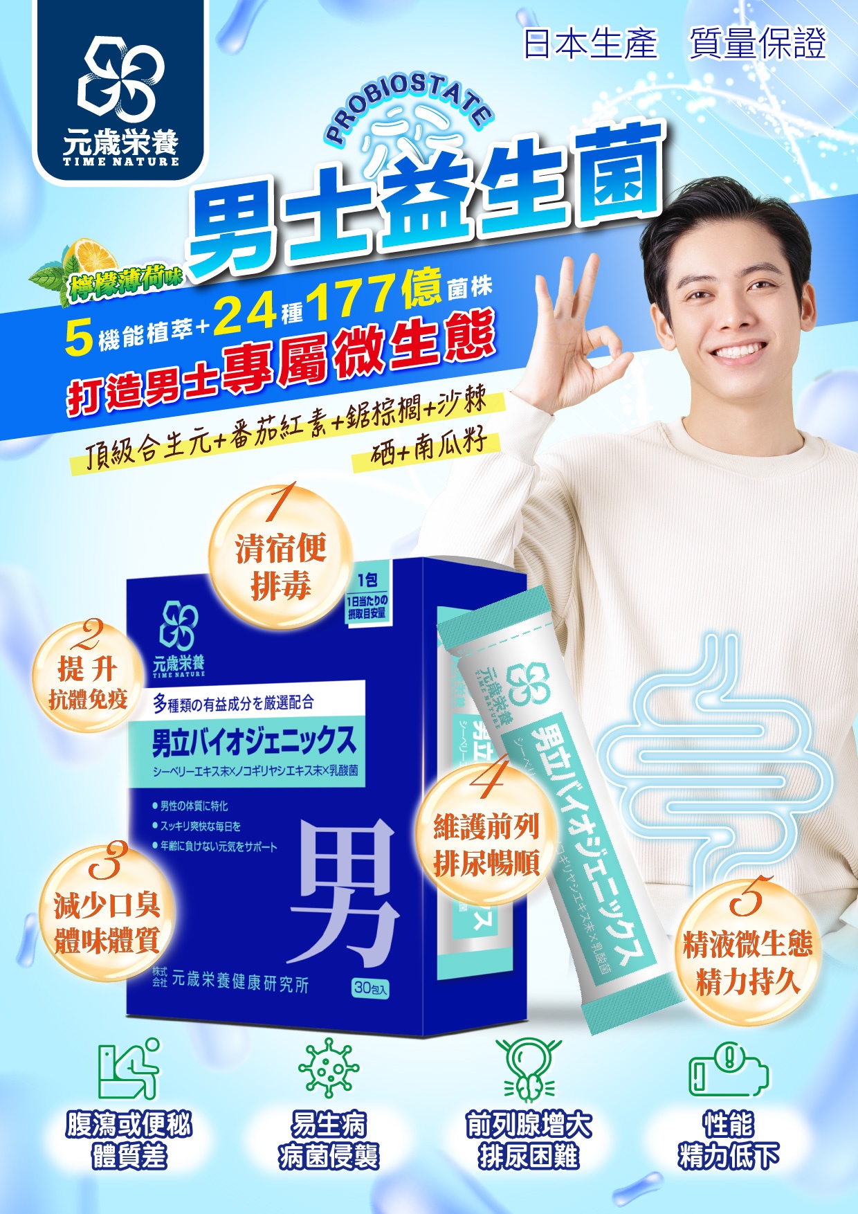 元歲榮養男士益生菌177億24 種活菌(5 種雙歧桿菌 + 14 種乳桿菌!)專門為男士日常定制,把「益生菌