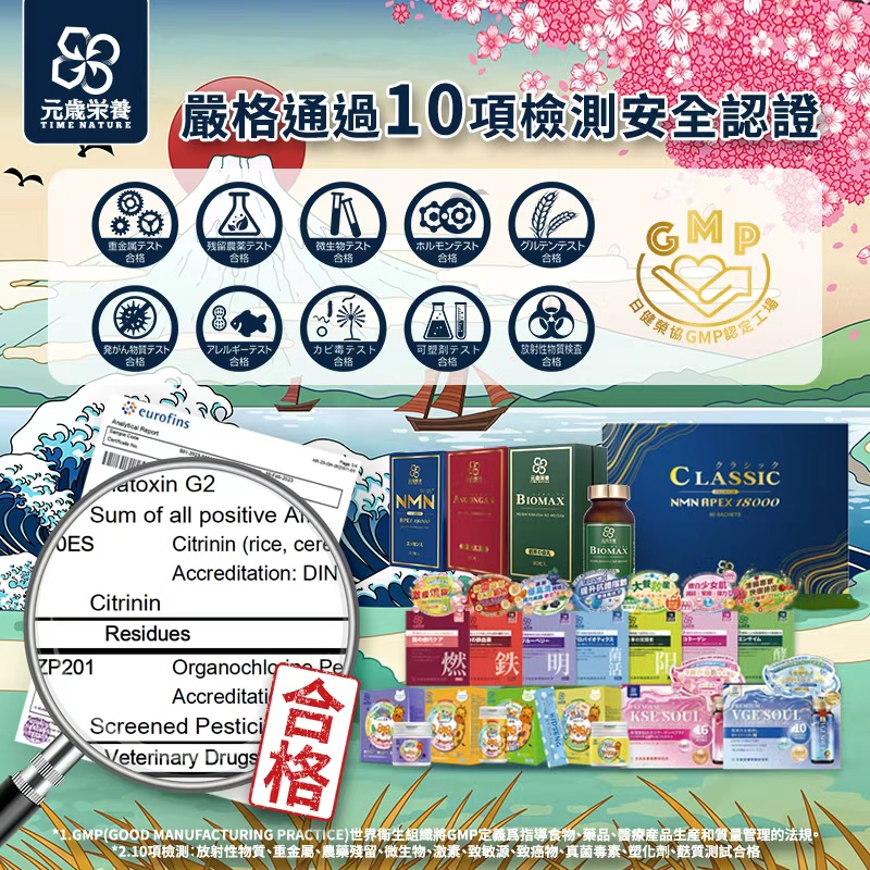元歲榮養堅持源自日本科研標準,於無核輻射區GMP認證工廠生產,秉持生產安全、健康產品的理念,我們在研發和生產過程中,對全系列產品進行了嚴格的檢測控制,並且每項產品均通過國際權威協力廠商檢測機構10項嚴格檢測🔬,確保產品不含有害物質。我們不僅追求產品的美味與營養價值,更是將產品的安全性和對人體健康的正面影響放在首位,堅守最高品質管制標準。💯。